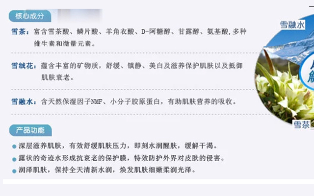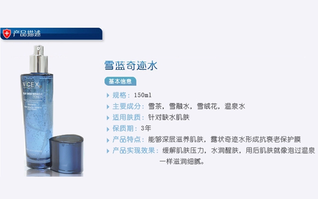 雪藍奇跡水 功效: 深度滋養(yǎng),舒緩肌膚壓力,水潤醒膚;露狀的奇跡水形成一層保護膜,防護外界對表皮的侵害,促進肌膚時刻都能吸收到溫泉水分,令肌膚得到完美的潤澤,煥發(fā)肌膚細嫩柔潤光澤。